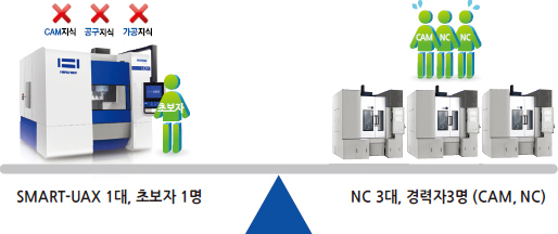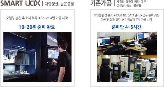 | 생산량 | 단기 집중 생산 : 기존 NC 2~3대가 많음 장기 다량 생산 : 주야 휴일 없이 빠른 SMART UAX 많음 | |