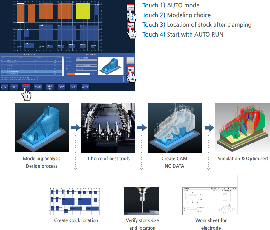 | 1. Ready for machining | - Put stock after modeling - Beginning with 4 Touch only - Ready for machining in 10~20 minutes | - Modeling analysis - Prepare CAM & NC DATA - Set for tools - Modify every status before machining - Beginning with put stock - Ready for machining in 4~6 hours |